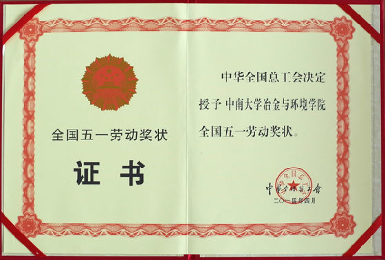“全国五一劳动奖状”由各省推荐,中华全国总工会评选授予,是当前集体奖的最高荣誉。冶金与环境学院由学校工会推荐,校党委审定,在湖南省教育工会的初选中一枝独秀,经湖南省总工会推荐,中华全国总工会考核,获此殊荣。这也是我校迄今为止唯一一家由学校申报,并获此殊荣的单位。